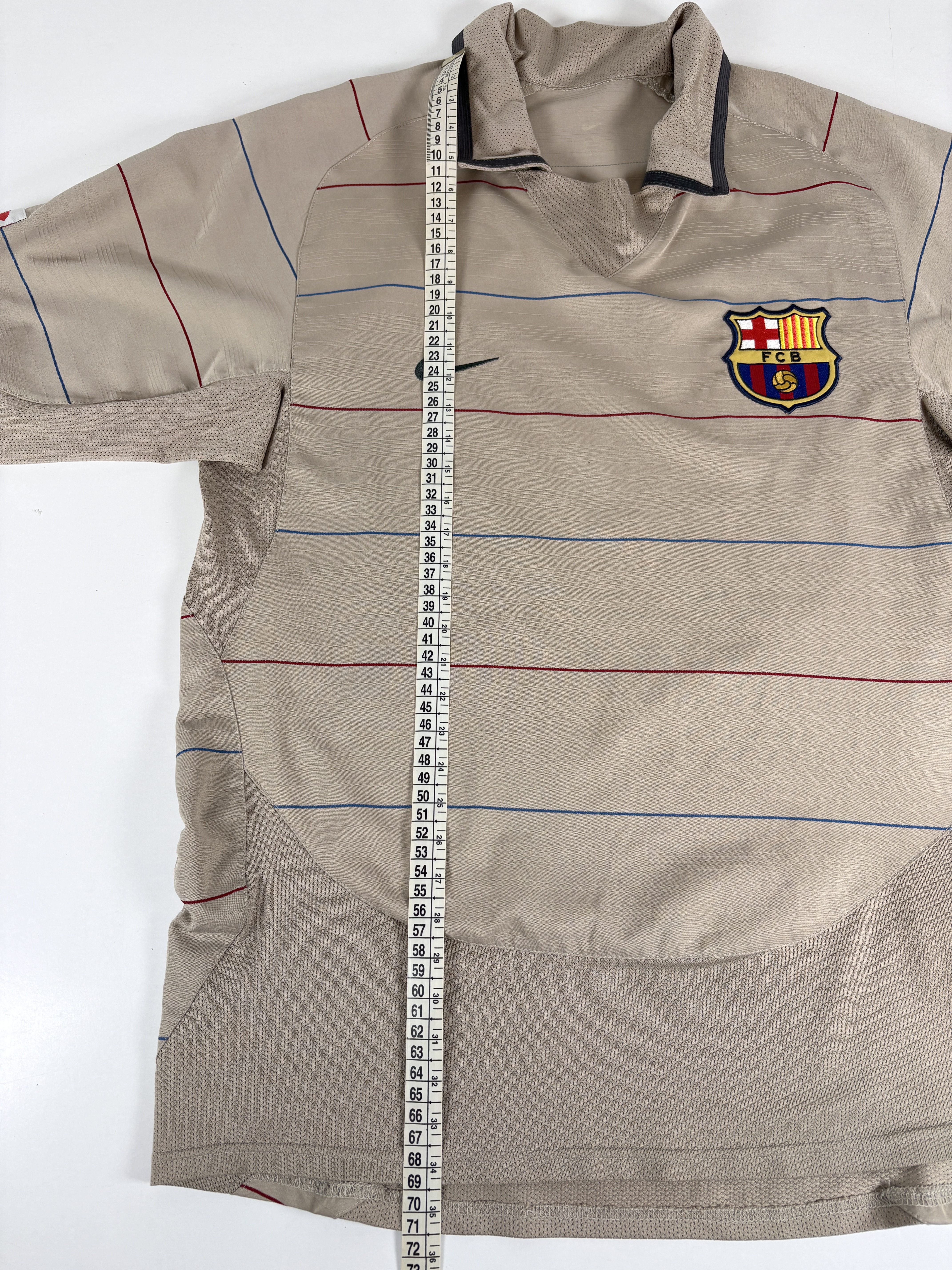 Condition: Used (pre-owned), good overall (7/10). Rare FC Barcelona away/third shirt. The fabric feels nice overall, but please note a couple of small dot marks (chest and sleeve) and a small area of bobbling near the collar/lapel. The printed size details have faded, but it fits like a Small/Medium — please check the measurements before purchasing. Comes from my personal collection. Price reflects the condition. Please review all photos carefully and feel free to message me with any questions.