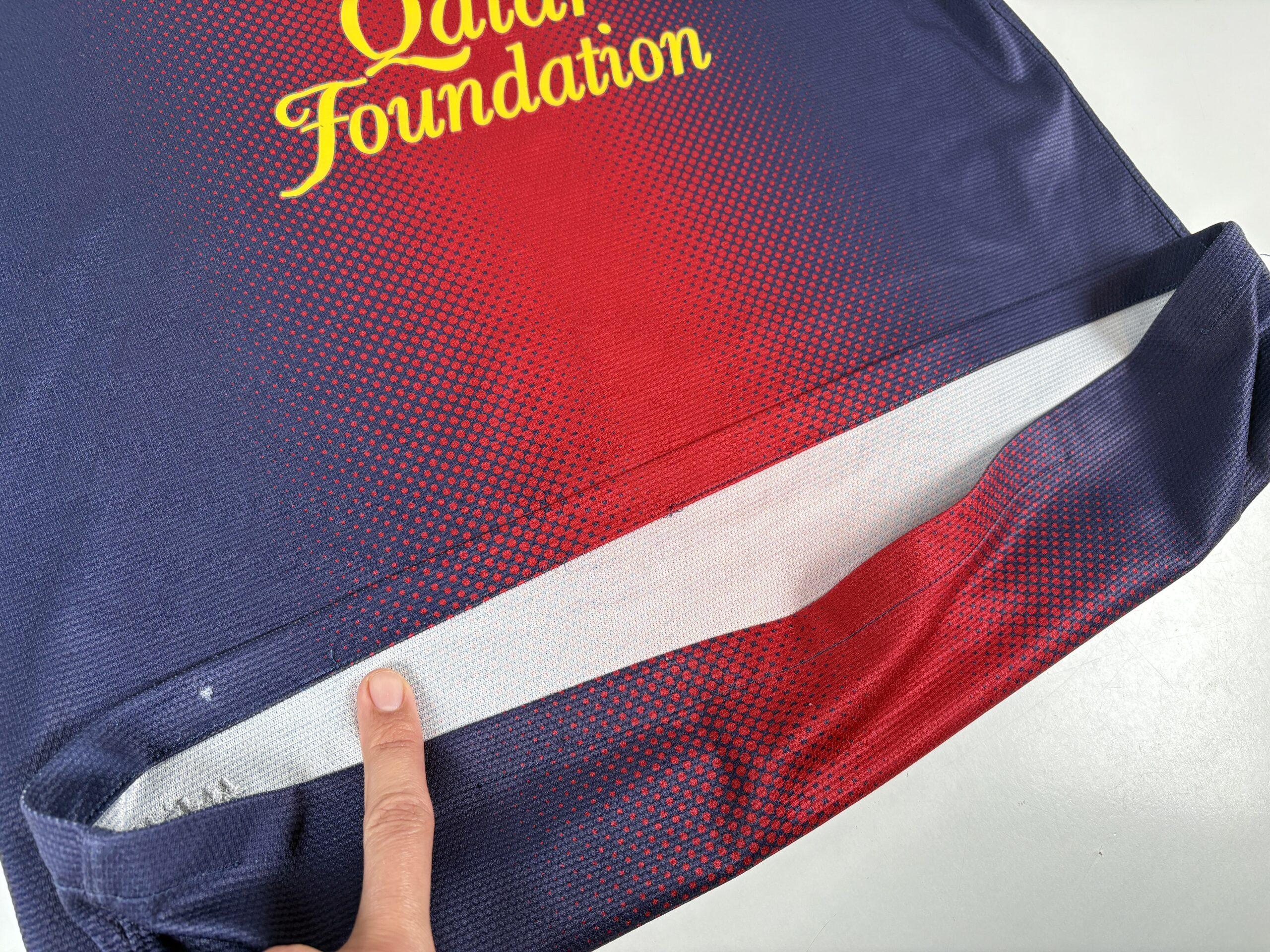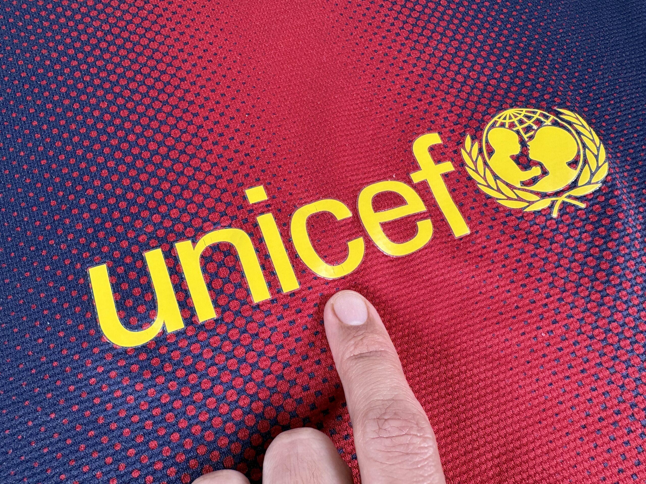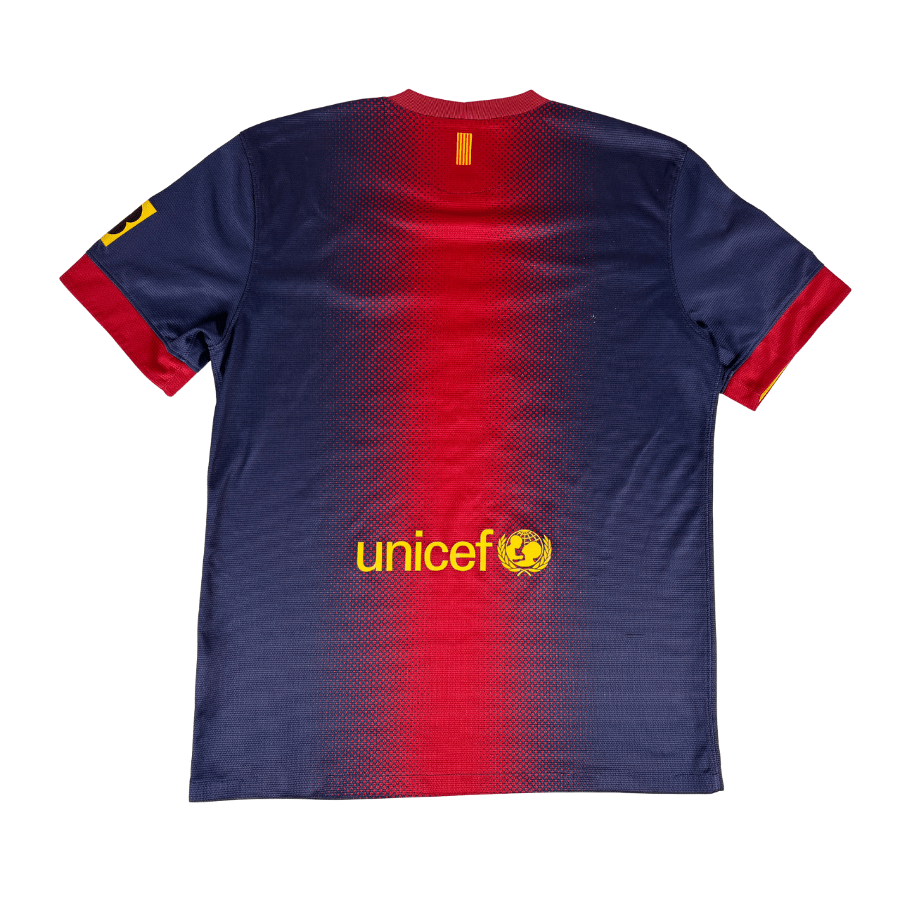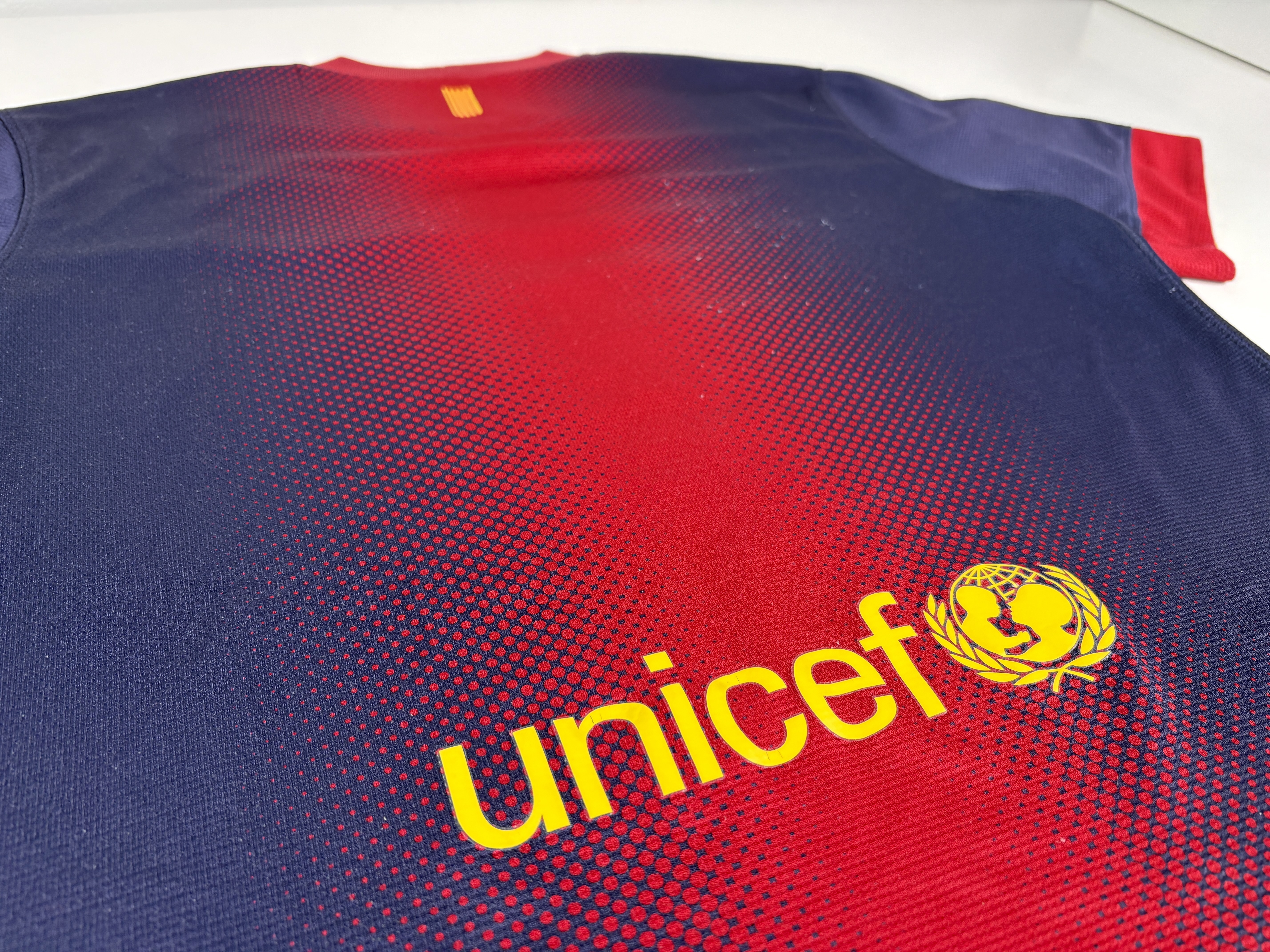 Conditions: Used (pre owned) in Fair/Good Conditions 5/10. One of the coolest design of the Barça with Nike. The main sponsor has minor damage. It has a couple details on the sleeve. has several tiny pulls. The lower seam has loose threats and it was reattached with fabric glue tape. UNICEF logo has some tiny cracks. the price is based on condition. The size chart is vanished, but in the inside tags you can see the size Medium and model number. Please see the photos and do not hesitate to ask.