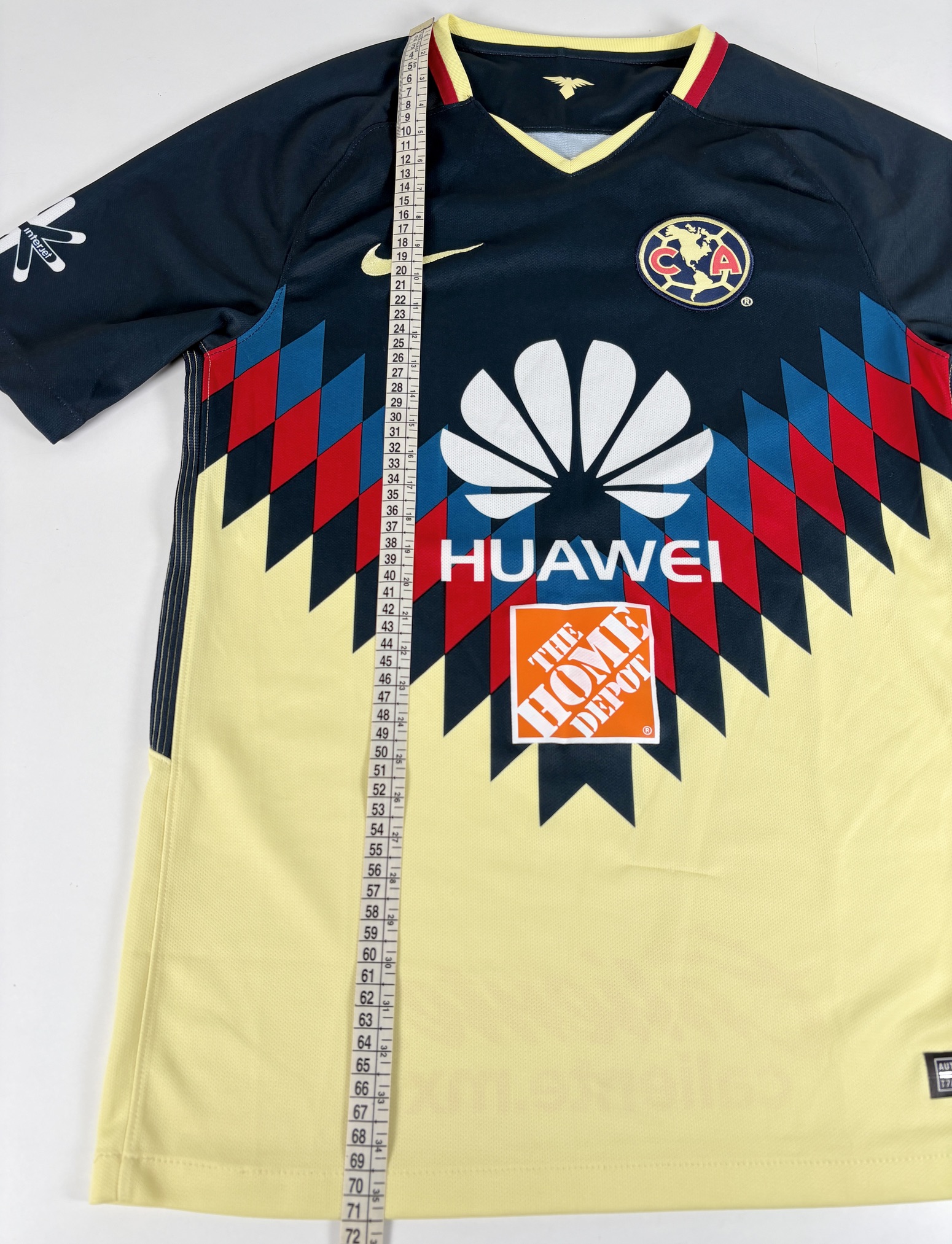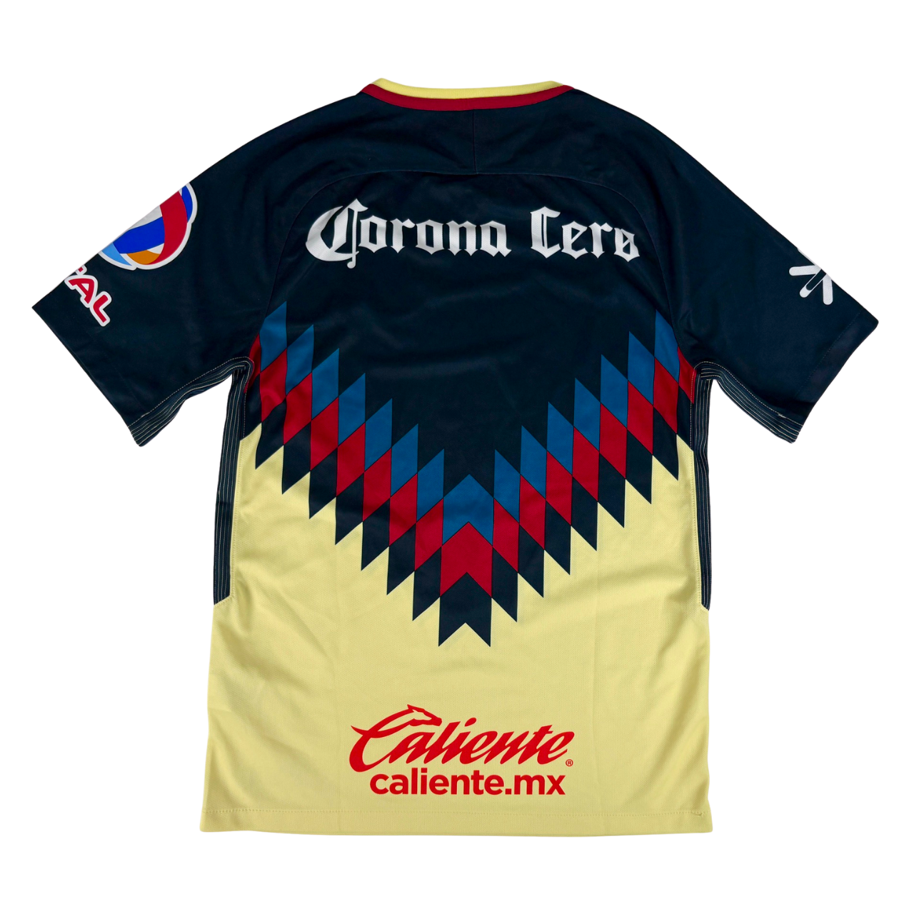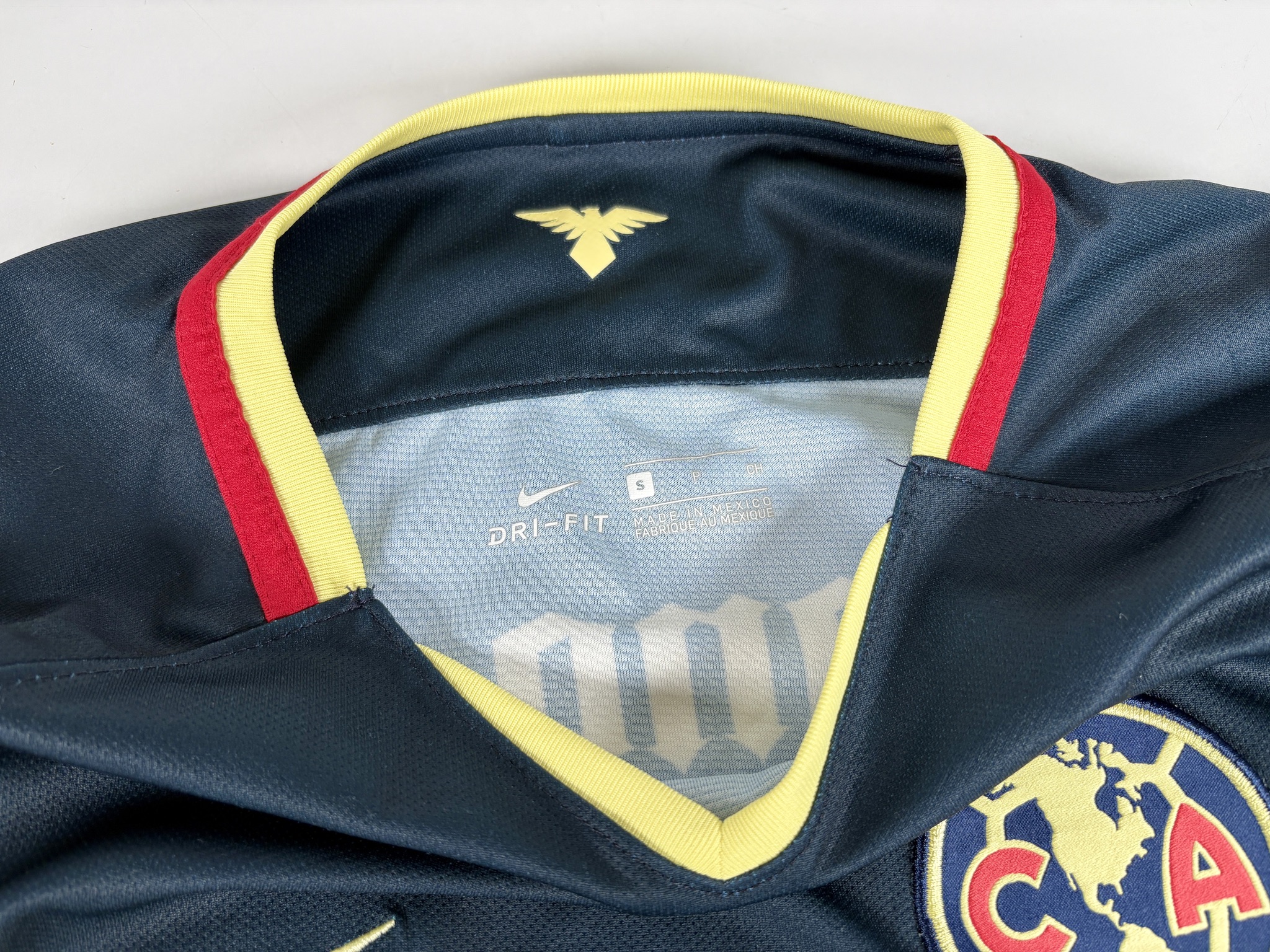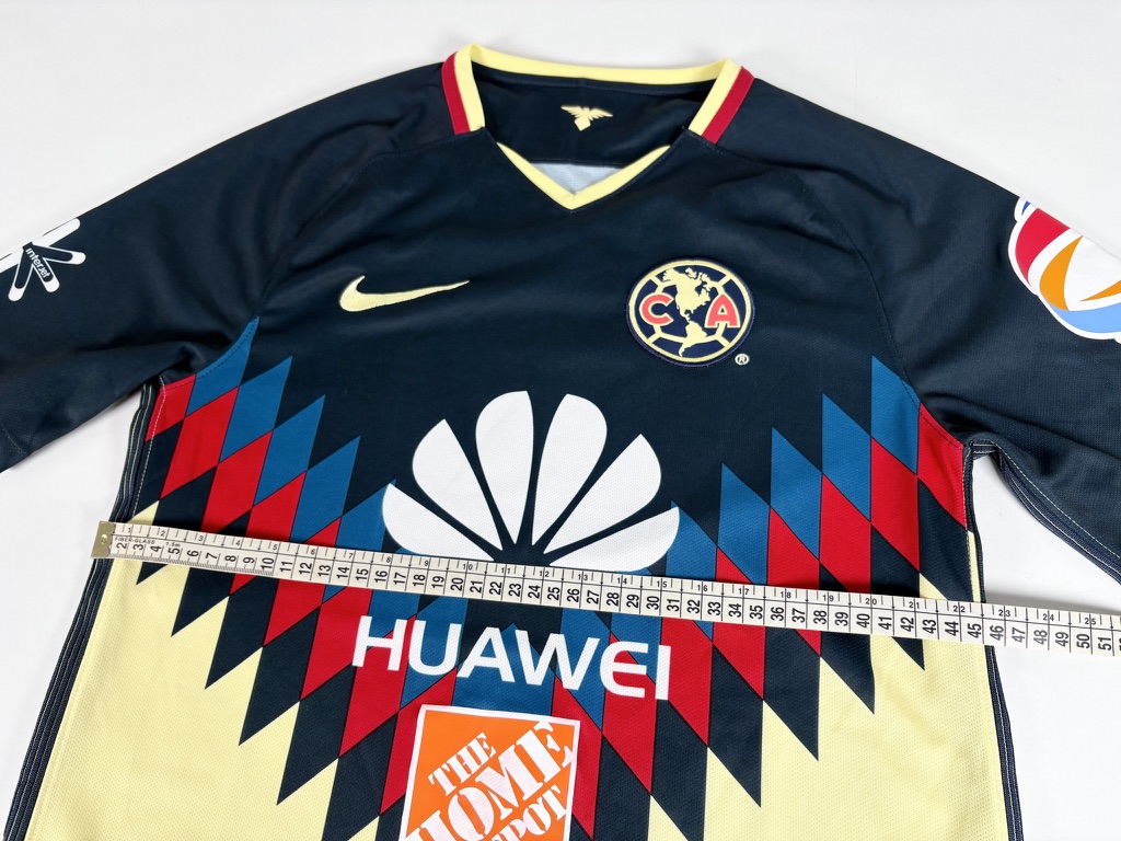 Condition: Used (pre-owned), very good overall (7.5/10). Club América Nike home shirt. Club crest and Nike swoosh are stitched. Printed sponsor shows minor wear, and the sleeve sponsor has a tiny crack. Please note: one larger pull/snag on the lower front (see photos). Please review all photos carefully and feel free to message me with any questions.